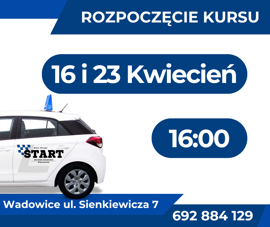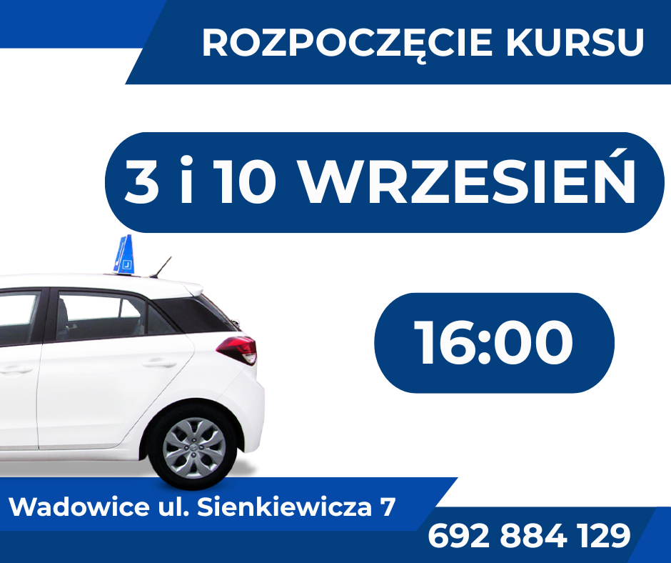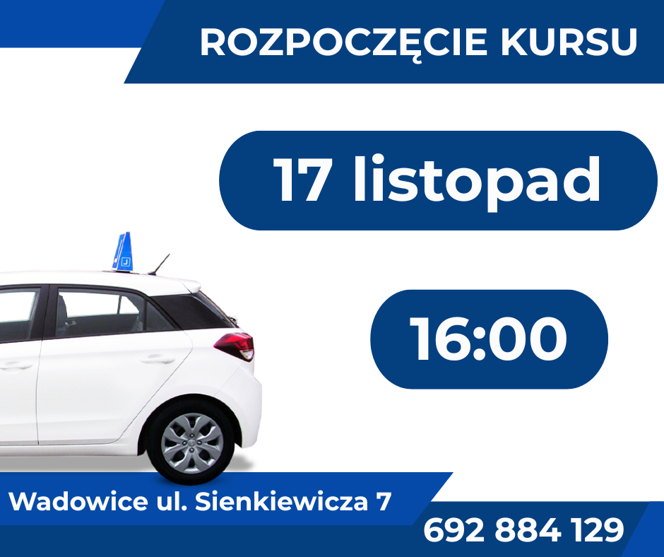 Zapraszamy serdecznie na kurs prawa jazdy kat. B, który startuje w terminie: 17 listopad o godz. 16:00 Zapisy w biurze: ul. Sienkiewicza 7, Wadowice Telefon: 692 884 129 Każdy kursant otrzymuje materiały szkoleniowe GRATIS!